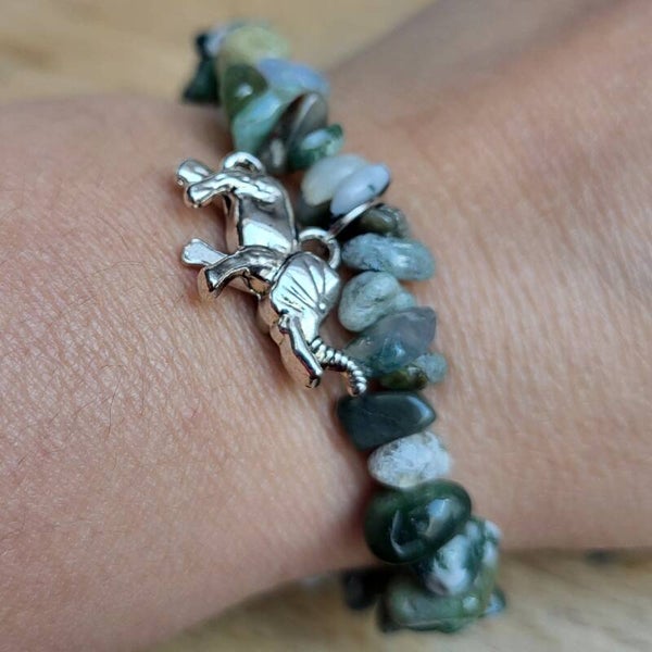 Les perles chips d’Agate Mousse, d’environ 7 mm, dévoilent des nuances vert tendre, brun et ivoire, rappelant les paysages luxuriants d’une savane verdoyante. Pierre d’équilibre et de connexion à la nature, l’Agate Mousse favorise la stabilité émotionnelle et la sérénité intérieure. Le bijou est rehaussé de breloques en métal argenté et d’un pompon vert foncé pour une touche végétale élégante.