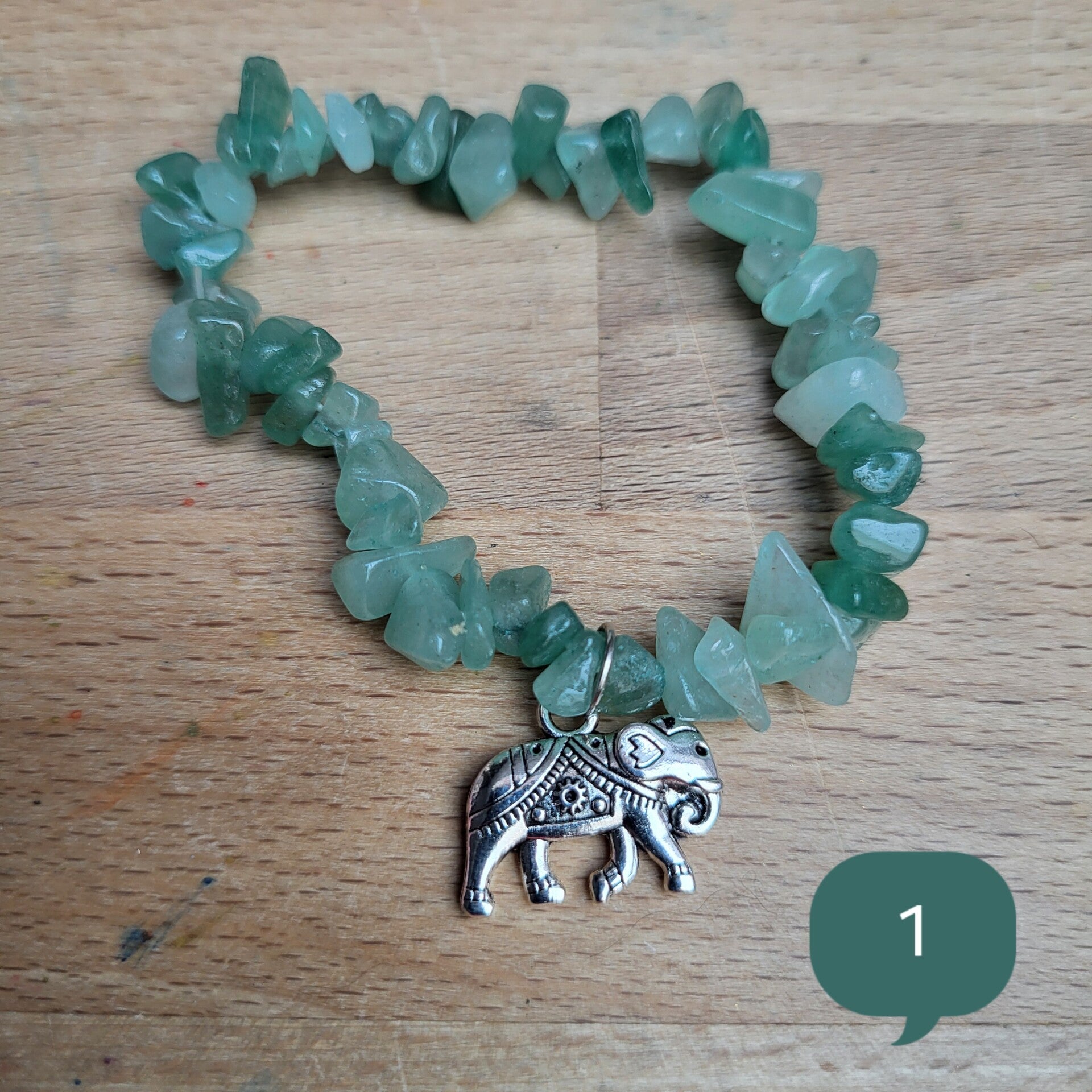Les perles chips d’Aventurine verte, d’environ 7 mm, diffusent des reflets doux et lumineux. Connue comme pierre de chance et de prospérité, l’Aventurine apaise les émotions, stimule la créativité et renforce l’intuition. Le bijou est agrémenté de breloques argentées en forme d’éléphant, symbole de sagesse et de protection, pour une touche ethnique porte-bonheur.