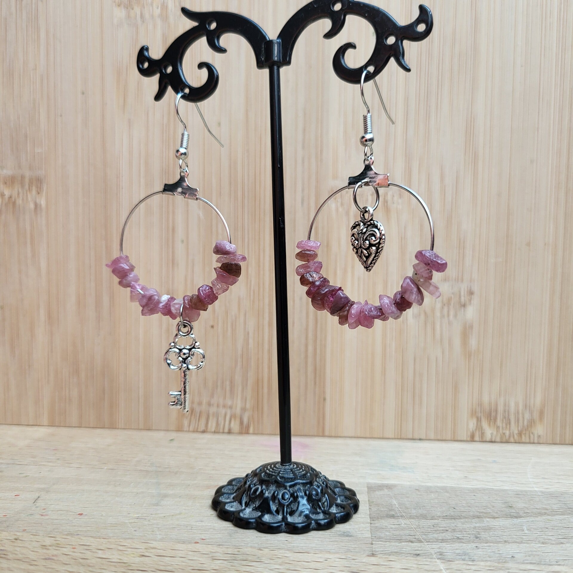Boucles d’oreilles « Rosée frivole » – Tourmaline rose et charme asymétrique