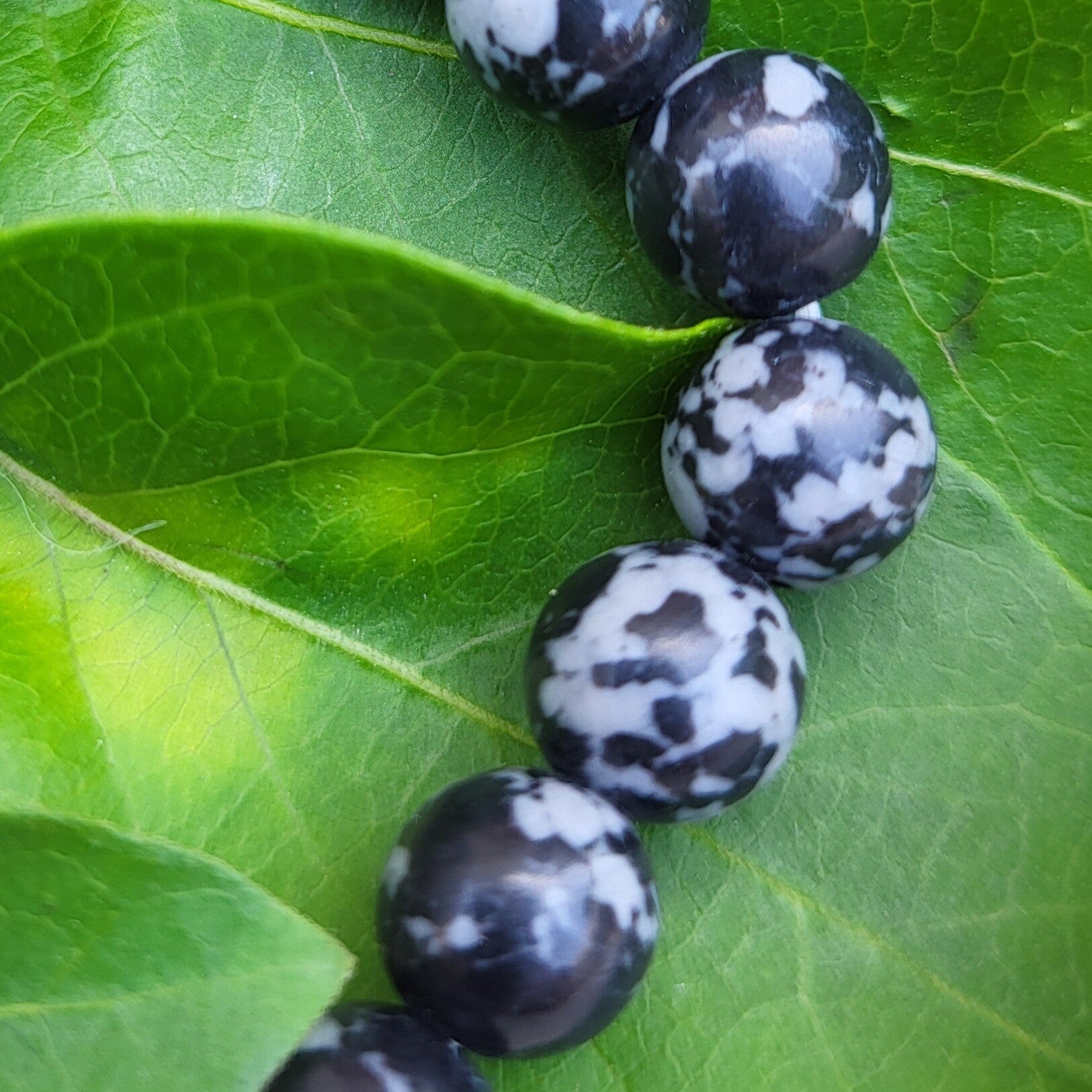 L’Obsidienne Flocon de neige se reconnaît à son noir ponctué de motifs gris clair, rappelant de délicats flocons figés dans la pierre.