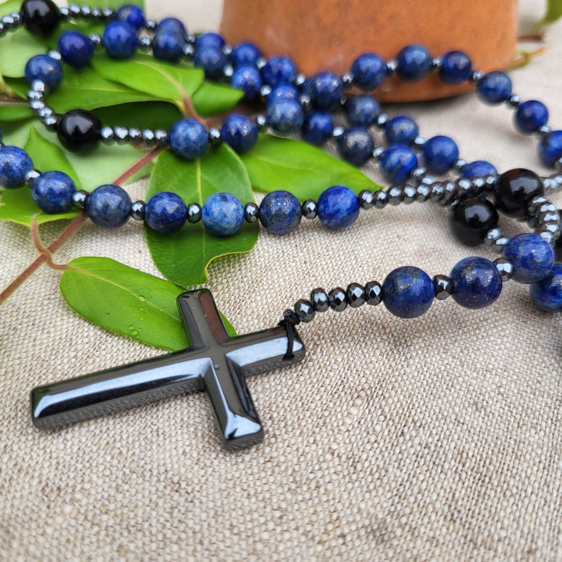 Élégant et profond, ce chapelet en lapis-lazuli allie la beauté des pierres naturelles à la symbolique de la prière. Le lapis-lazuli, pierre d’un bleu intense parsemé de reflets dorés, est associé depuis l’Antiquité à la vérité, à la sagesse et à la paix intérieure.