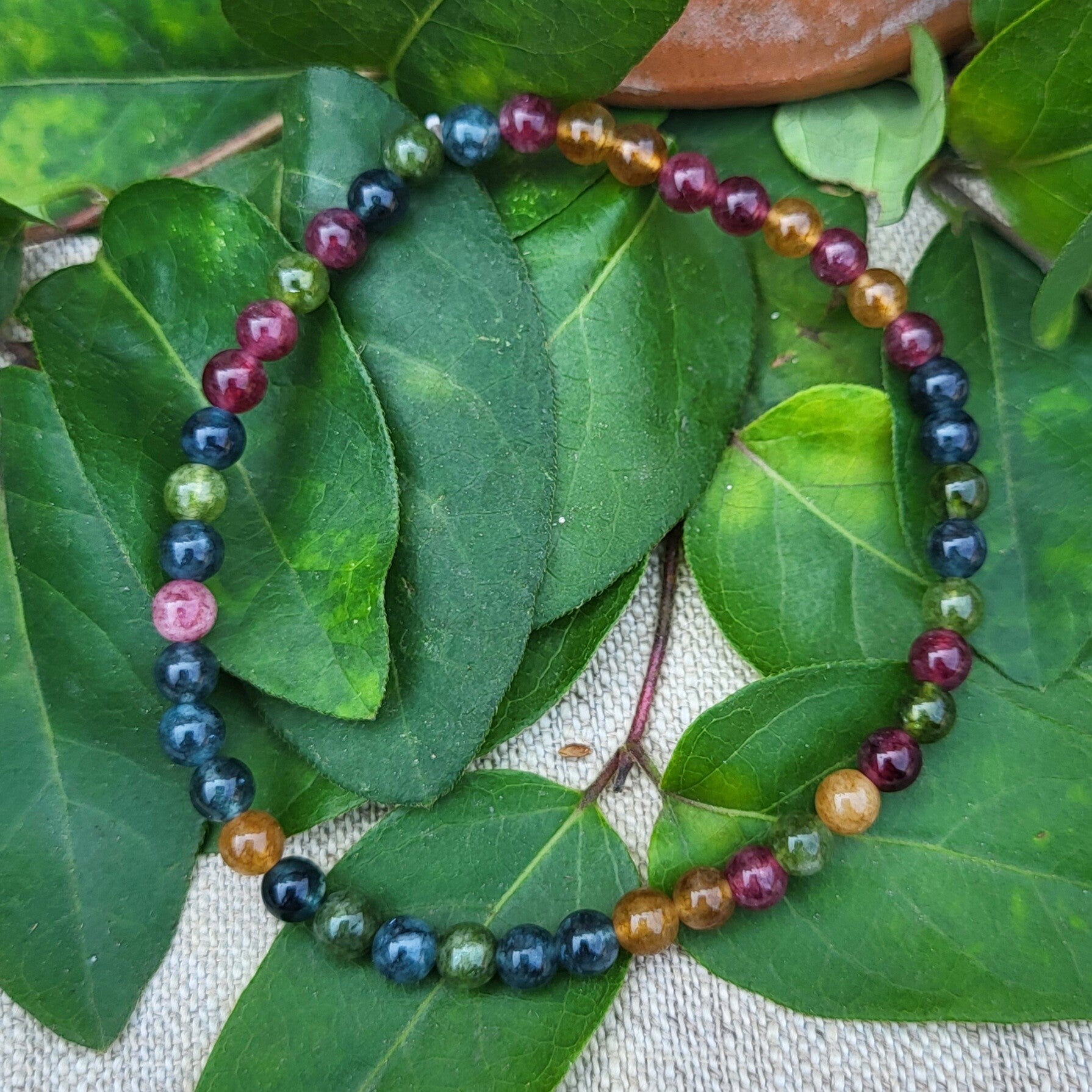 La Tourmaline multicolore dévoile une palette naturelle unique, allant des tons doux de rose, vert, jaune et brun aux nuances plus intenses. Chaque perle est différente, formant un dégradé harmonieux qui rend chaque bracelet véritablement unique.