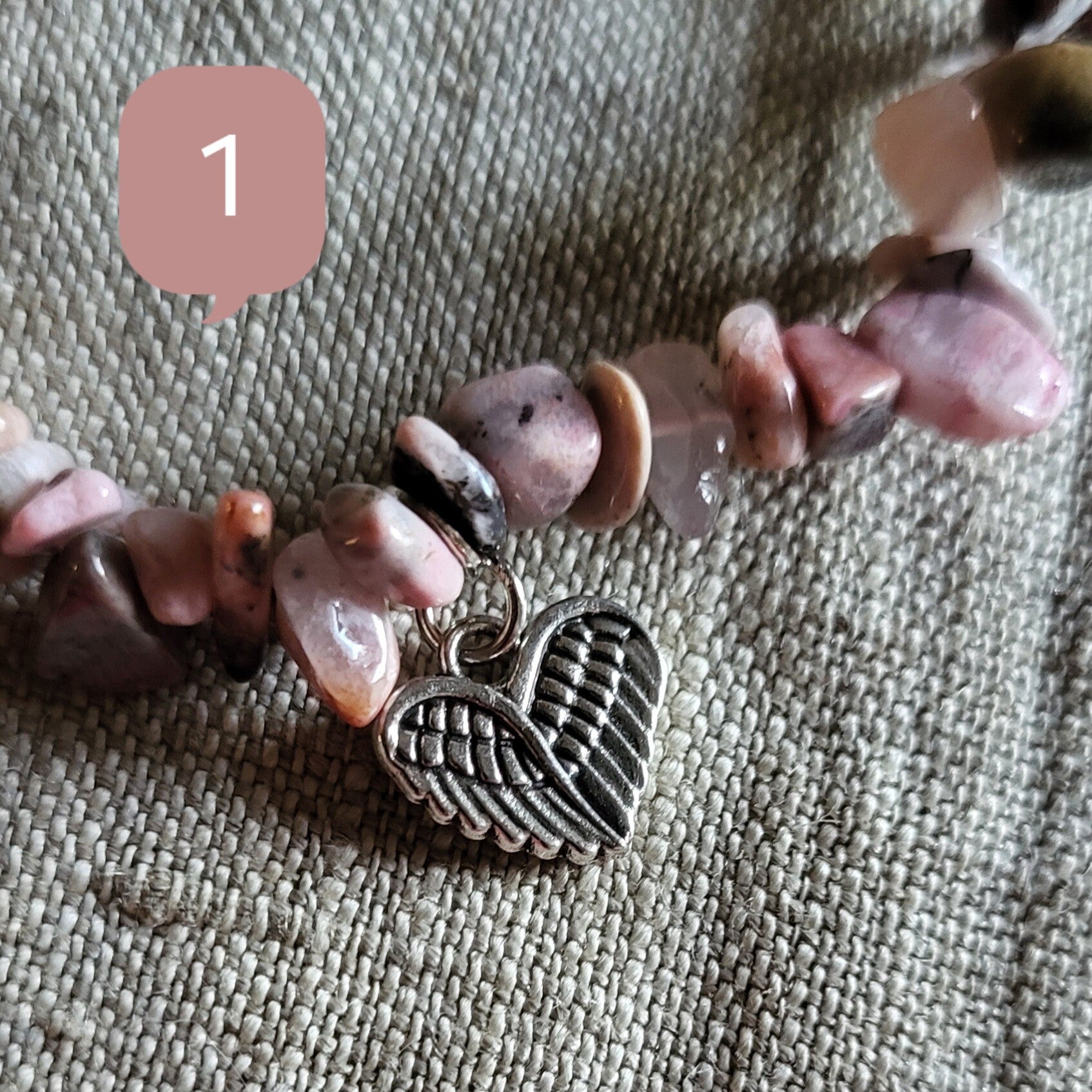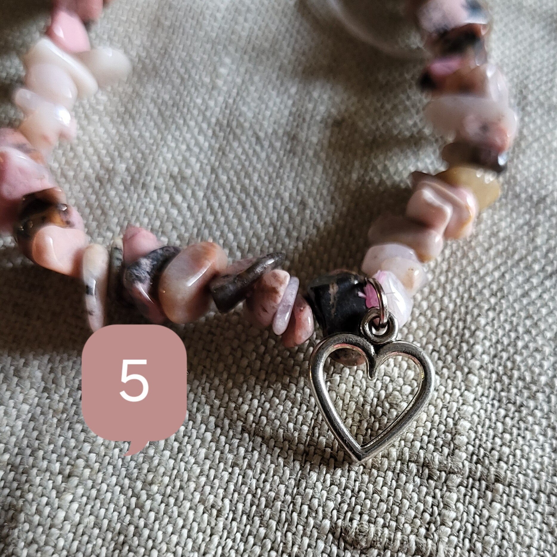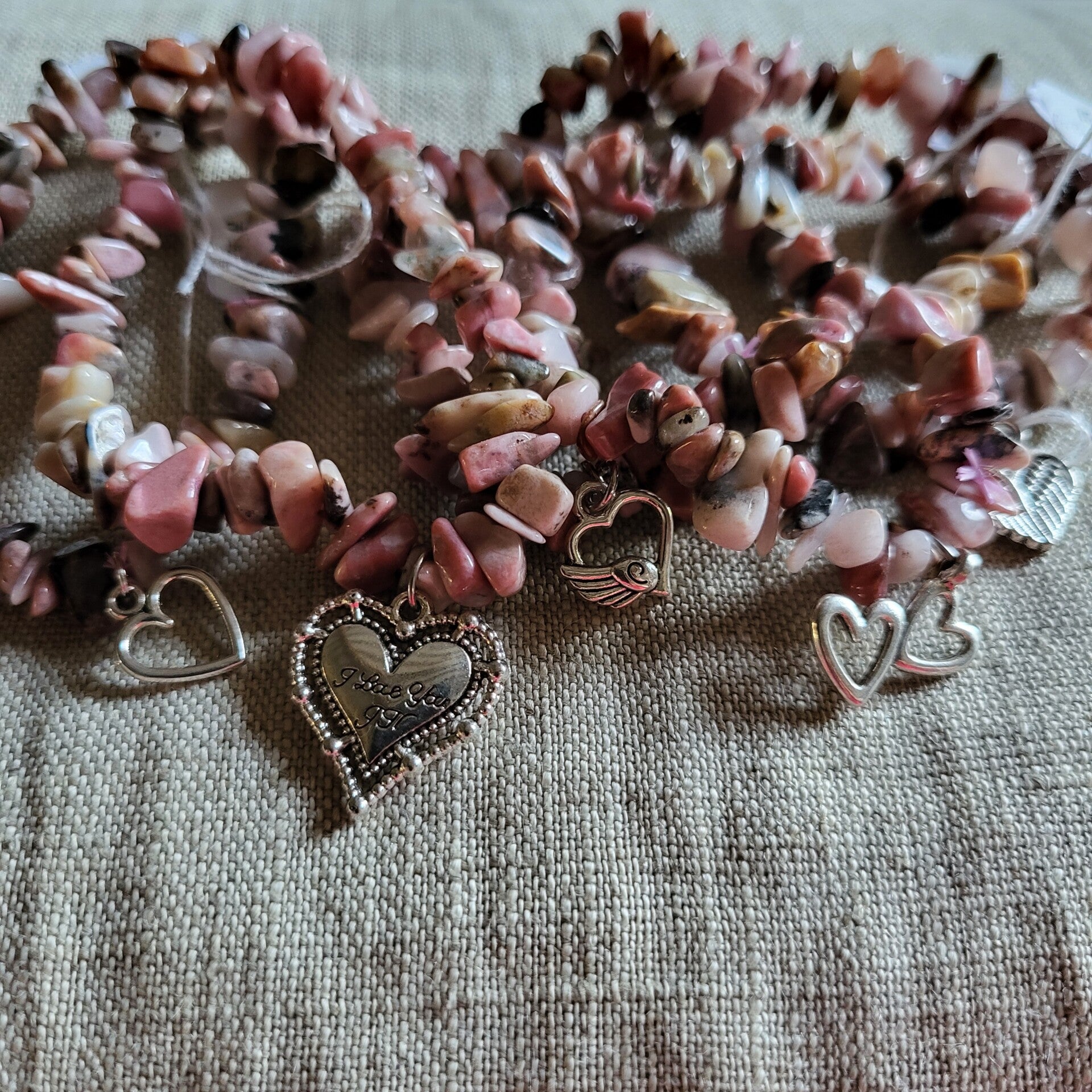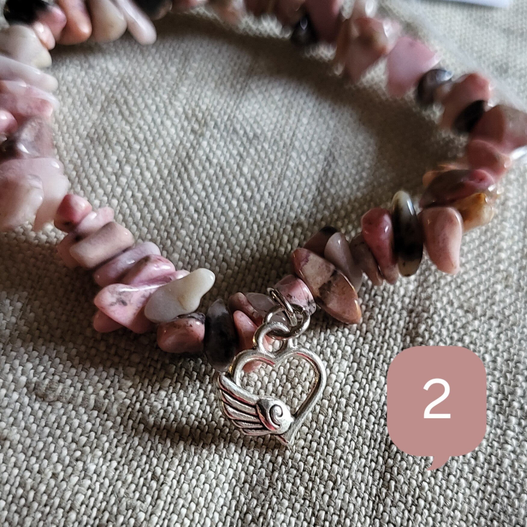Monté sur un fil élastique de 6 mm, ce bracelet convient aux poignets à partir de 17 cm. Les perles chips de Rhodonite (env. 7 mm) affichent des nuances douces de rose veinées de noir, créant un contraste élégant et naturel. En finition, des breloques en métal argenté en forme de cœur apportent une touche élégante et affectueuse à ce bijou plein de sens.